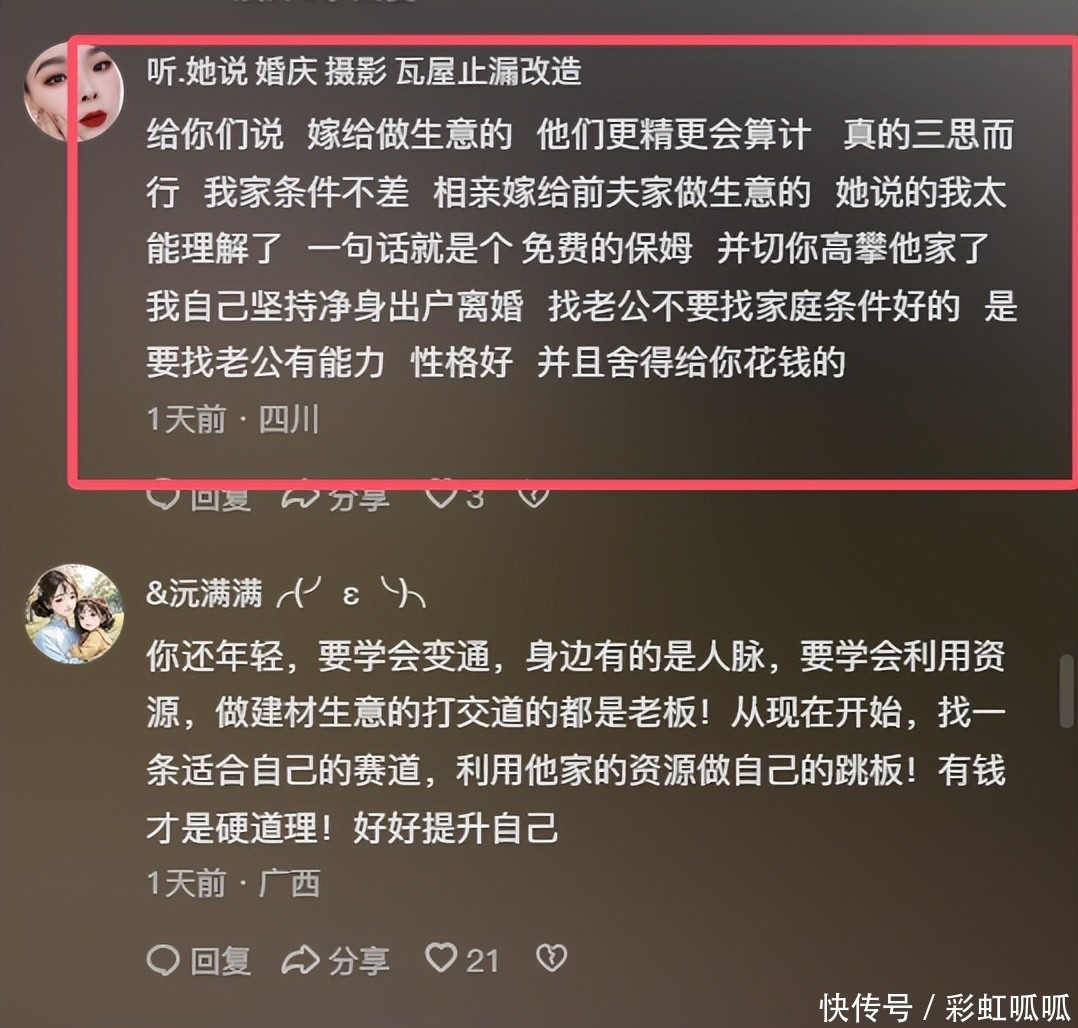 女子后悔的点是,这些年自己太傻了,上嫁是上嫁了,但婆家一直防着她,她没有意识到这一点。